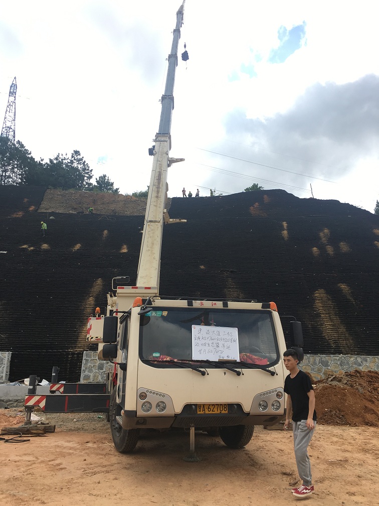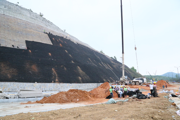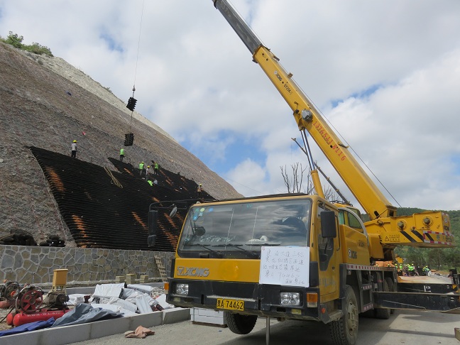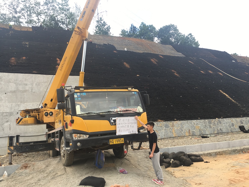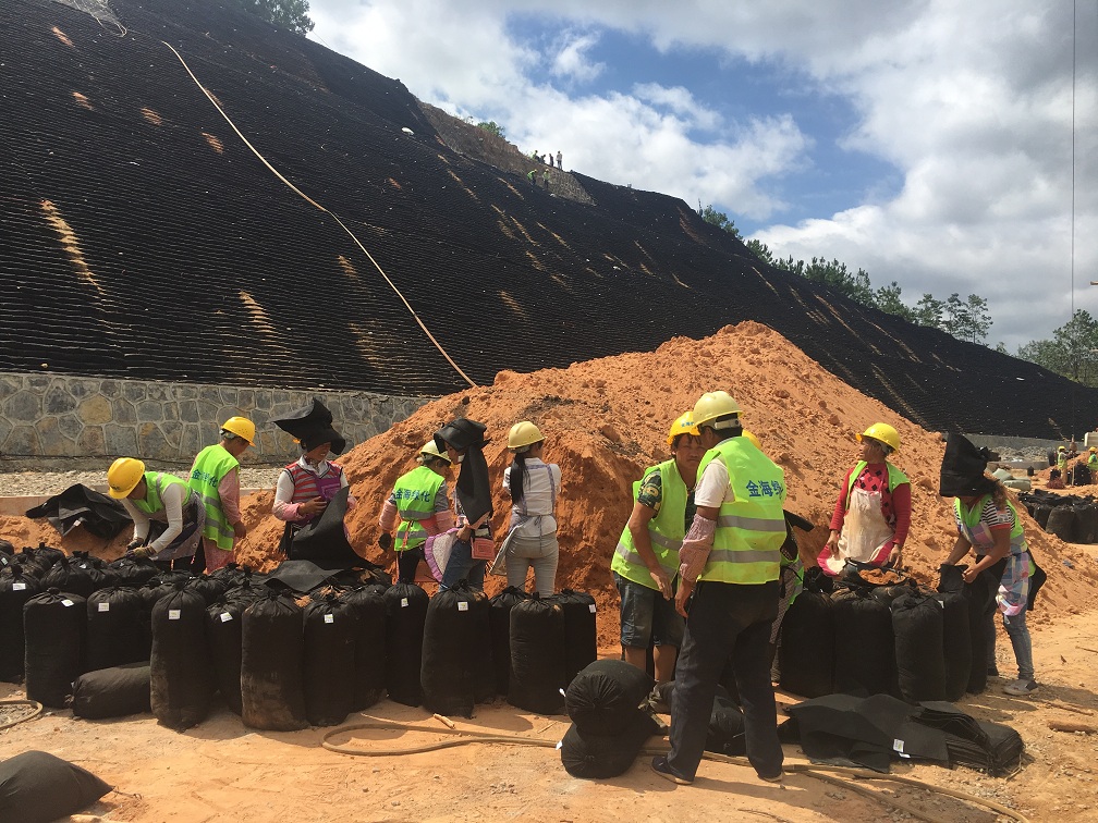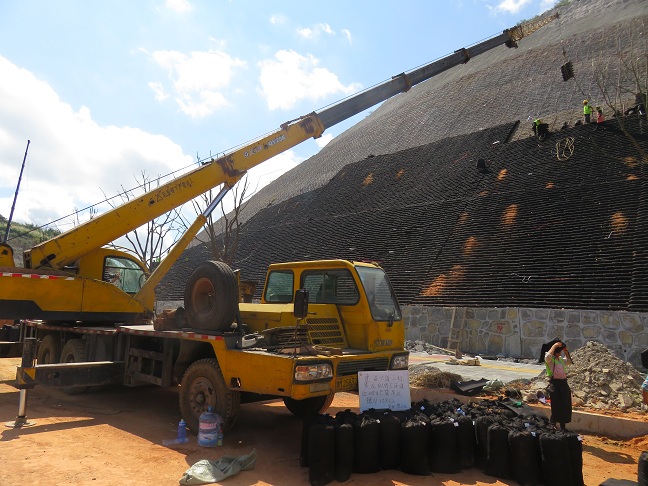 為節(jié)省時(shí)間,一邊在進(jìn)行打孔、打錨桿操作、注漿、焊接操作,另一邊進(jìn)行生態(tài)袋碼砌操作。