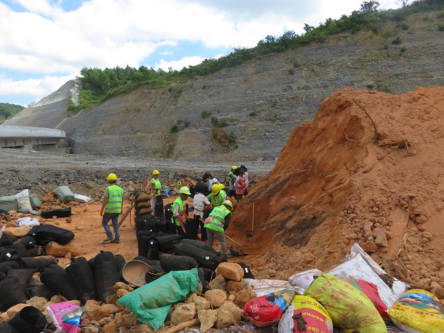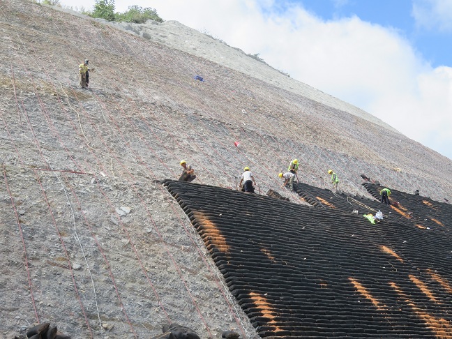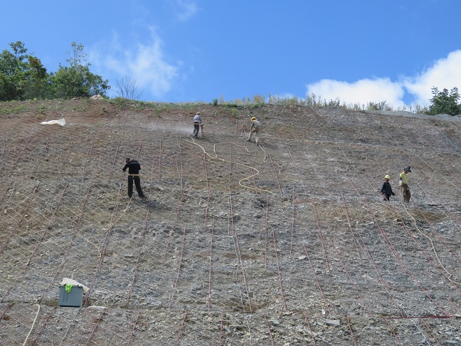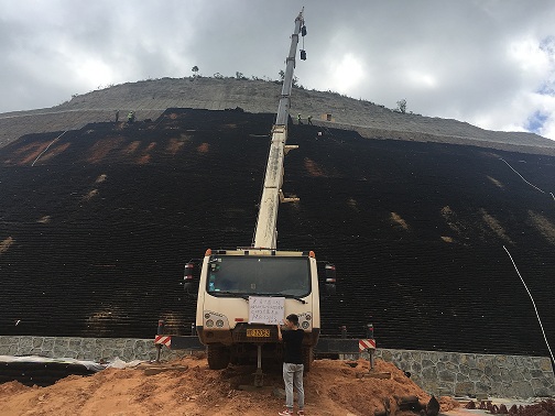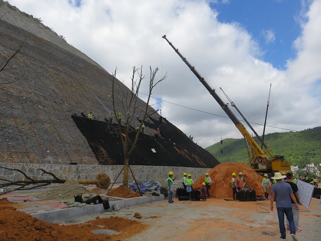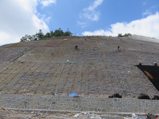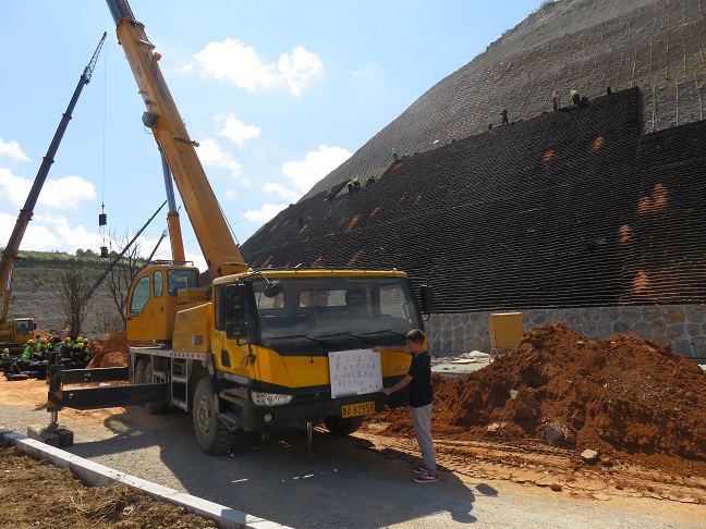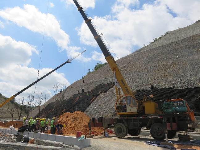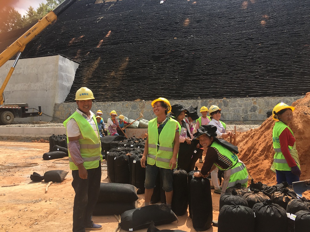 為節(jié)省時(shí)間,一邊在進(jìn)行打孔、打錨桿操作、注漿、焊接操作,另一邊進(jìn)行生態(tài)袋碼砌操作。